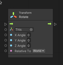 아래 이미지의 Rotate Transform 유닛의 다음 예에서 가장 먼저 주목해야 할 것은 이 유닛이 선택된 유닛임을 나타내는 가장자리의 파란색 테두리선이다. 유닛을 선택하면 옵션과 가이드가 그래프 검사기(Graph Inspector)에 표시된다.